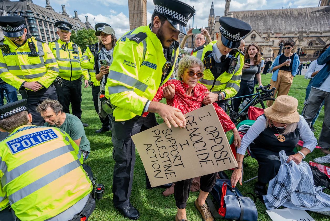 The demonstrators, described by campaign group Defend Our Juries as peaceful, were sitting outside the Met’s headquarters holding signs reading: “I oppose genocide – I support Palestine Action.”