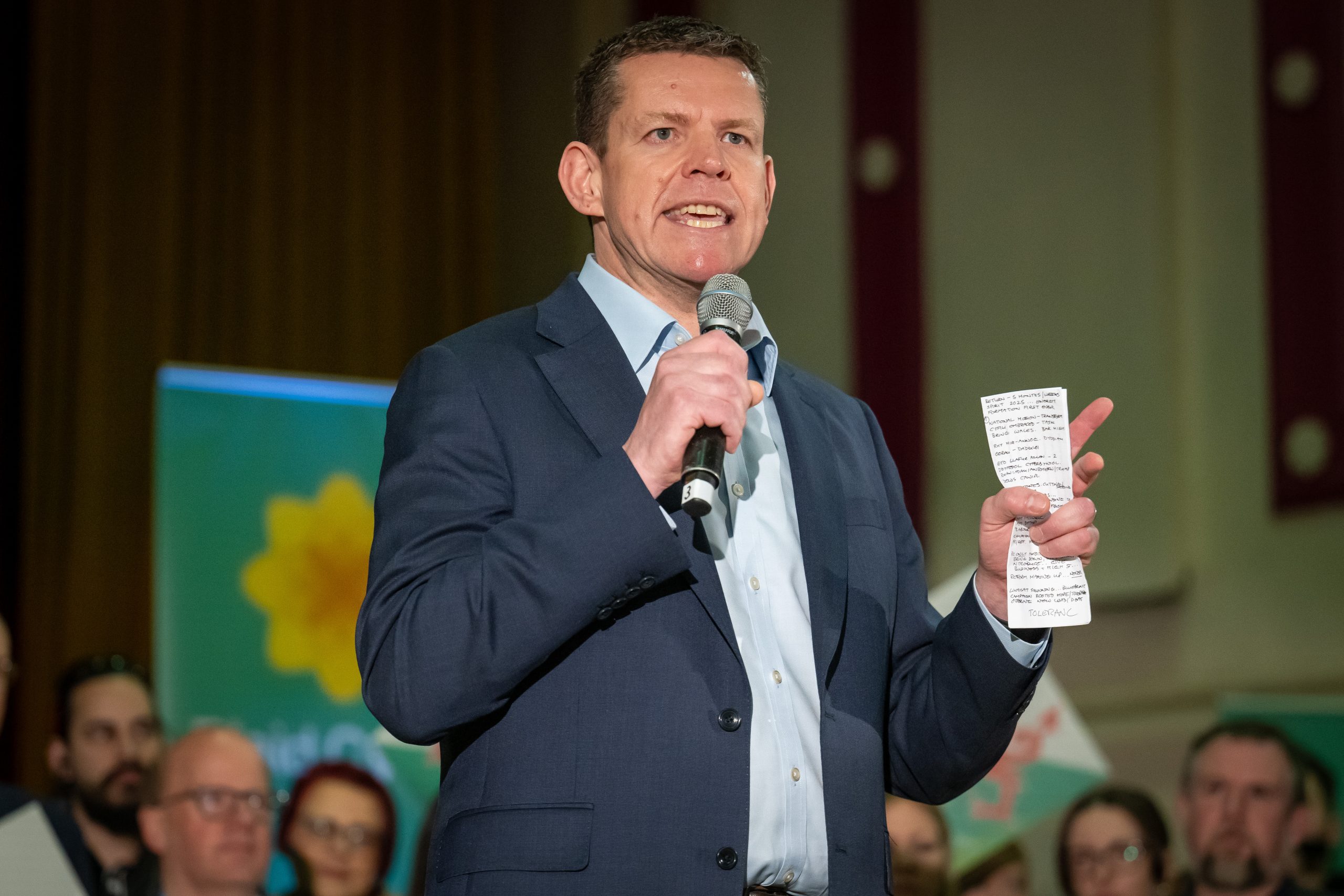 CAERPHILLY, WALES – MARCH 30: Leader of Plaid Cymru Rhun ap Iorwerth speaks during the party’s campaign launch at Bedwas Workmen’s Hall & Institute on March 30, 2026 in Caerphilly, Wales. Wales’ Plaid Cymru party is launching its campaign ahead of Senedd elections to be held on May 7.
