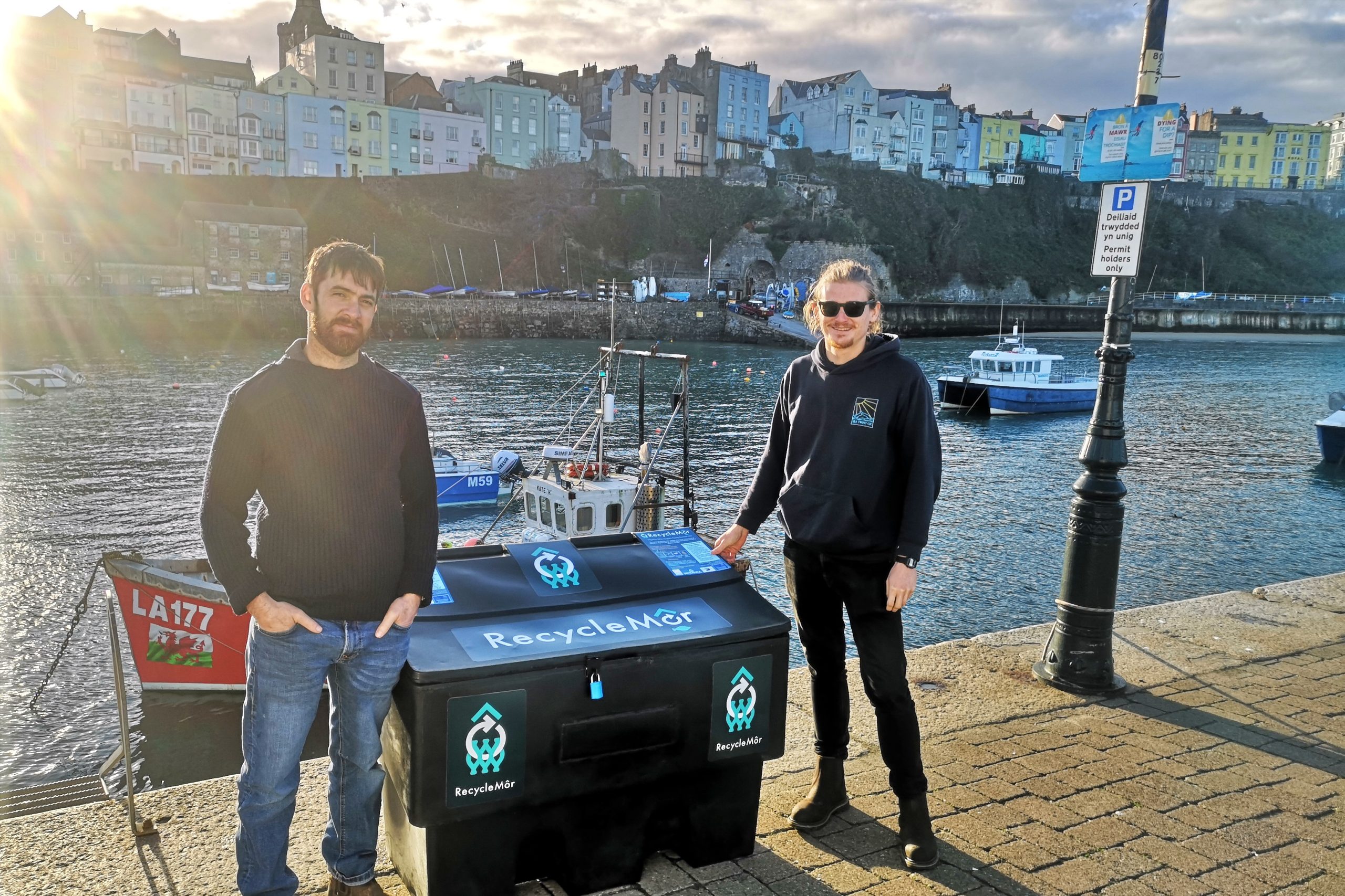 Lloyd and Chris with Recycle Mor Bin at Tenby Harbour