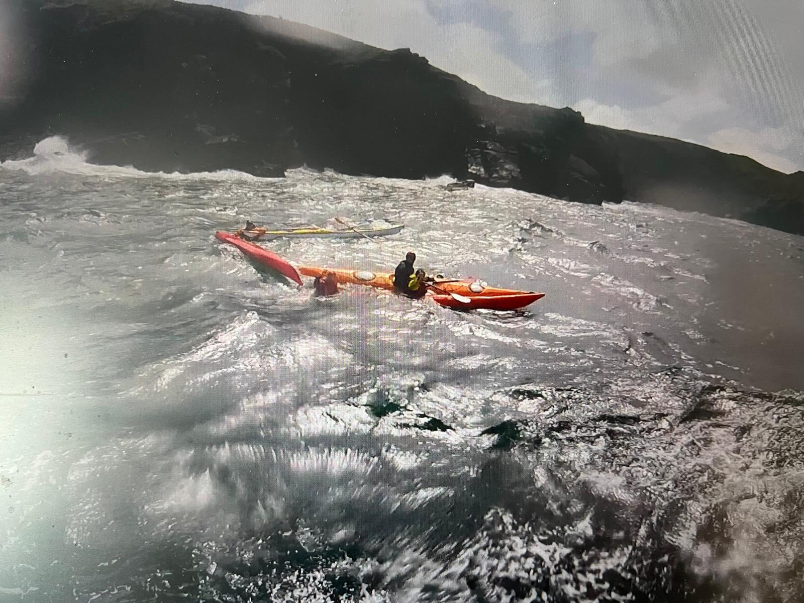On arrival at the scene, RNLI volunteers found two people in the water—one clinging to a partially submerged kayak and another still in their vessel, holding onto the sinking one. The remaining two kayakers were nearby and also struggling in the worsening swell.