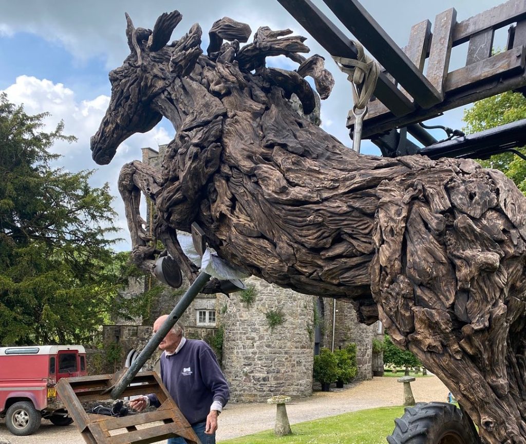 Giant driftwood horse sculpture ‘Ascent’ leaves Upton Castle Gardens for Spain
