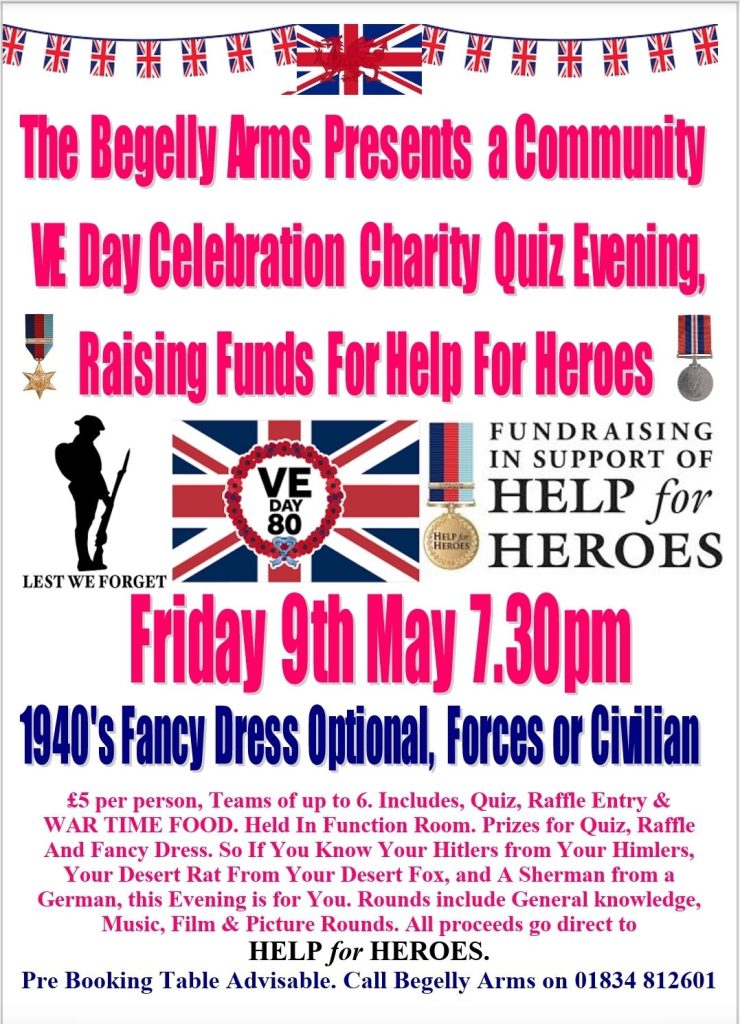 A COMMUNITY quiz night is being held this Friday (May 9) at The Begelly Arms to mark the 80th anniversary of VE Day, with all proceeds going to the armed forces charity Help for Heroes.