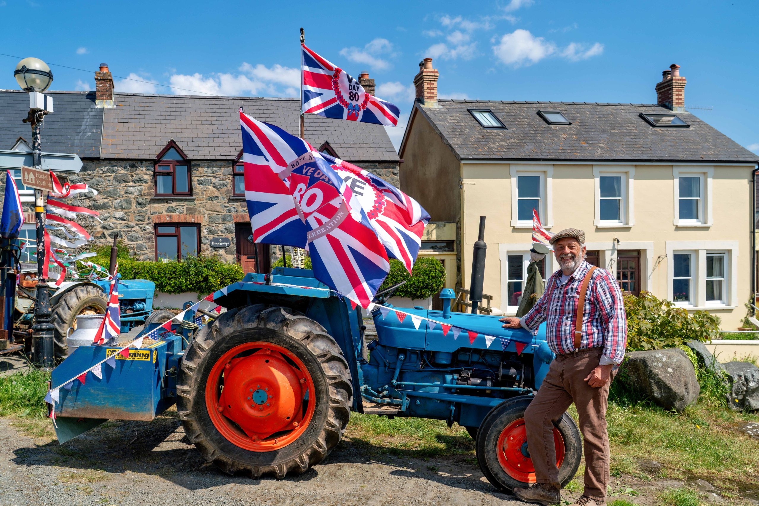 Vintage tractors and vehicles flew Union Jack and Welsh flags, with local farmer Martyn Hood’s tractor stealing the show, adorned with VE Day 80 bunting and cheer. Choir leader Sue Hood, seated on hay bales in the back of a trailer, waved to onlookers as she was towed through the village.