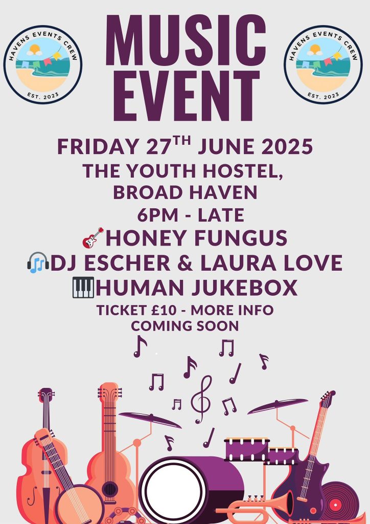 Taking place at the Youth Hostel in Broad Haven on Friday 27 June 2025, the evening promises a mix of bands, DJs and interactive performances, running from 6:00pm until late.