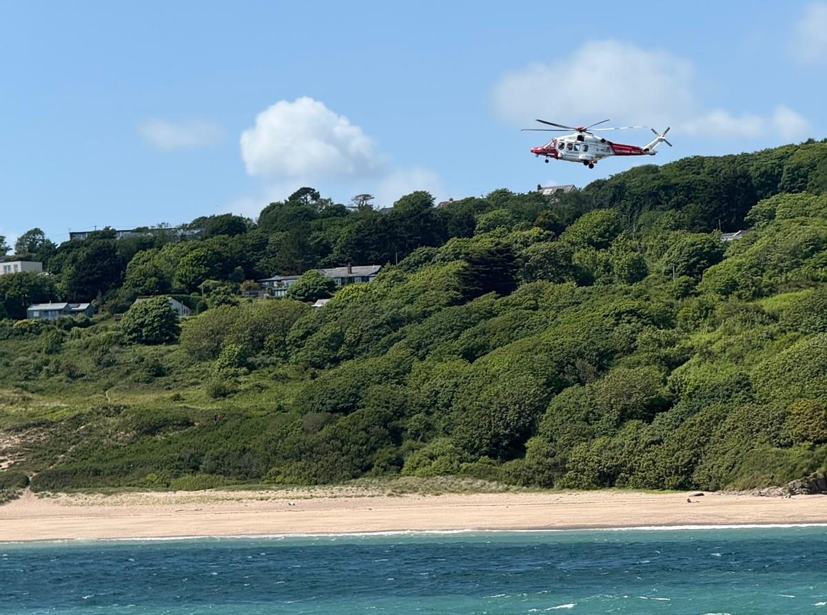A Coastguard rescue helicopter was requested and soon arrived on scene. A winchman was lowered onto the rocks to assess the casualties, who were found to be uninjured. They were then airlifted to safety and returned to Freshwater East beach.