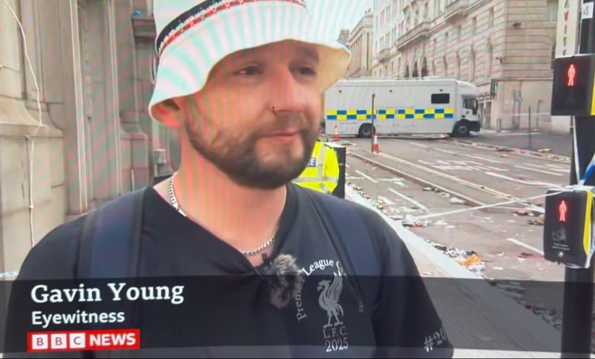 At the centre of it all: Gavin Young’s eyewitness interview on BBC News captured the chaos that unfolded during Liverpool’s parade (Pic: BBC NEWS)