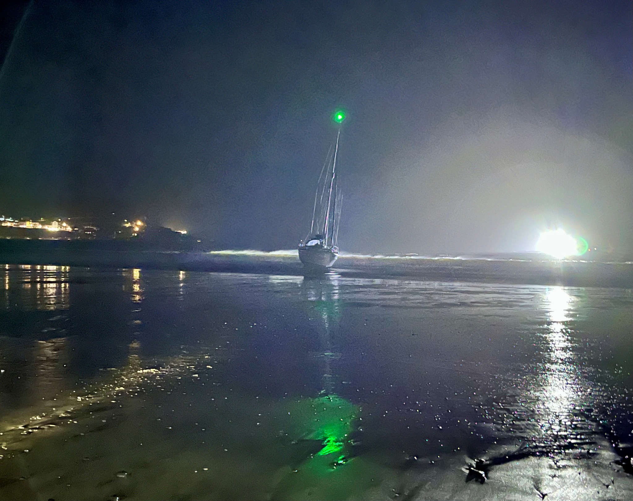 The distress call was received by Milford Haven Maritime Co-ordination Centre at around 1:40am. The yacht, which had a single occupant on board, was stranded in low water and breaking surf.