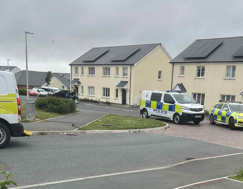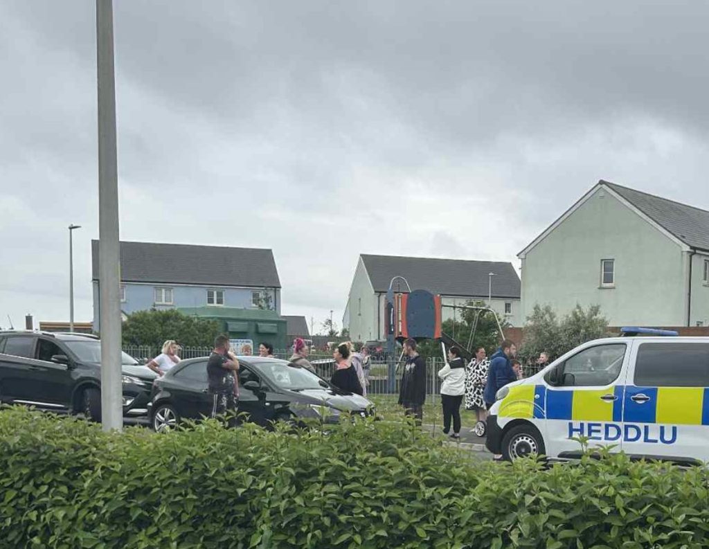 Photos shared with The Pembrokeshire Herald show officers attending a house on the estate and engaging with a growing group of bystanders near a play area.