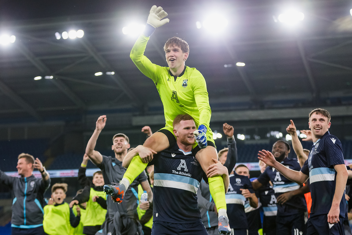Farewell hero: Zac Jones is hoisted aloft by teammates following Haverfordwest’s historic European qualification win at Cardiff City Stadium (Pic: JD Cymru Leagues/Facebook).