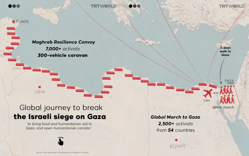 The march is timed to coincide with a 7,000-strong convoy approaching Gaza from Tunisia and follows a wave of global actions, including blockades, vigils and civil disobedience.