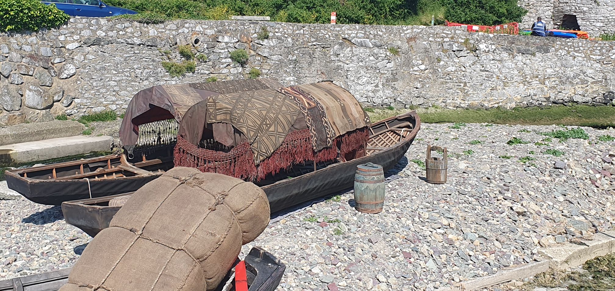 A second image shows a fantasy-style boat moored on the pebbled beach, complete with tribal-patterned canopy, wooden barrels, rope-wrapped crates, and ornamental netting — features not typical of any local period drama.