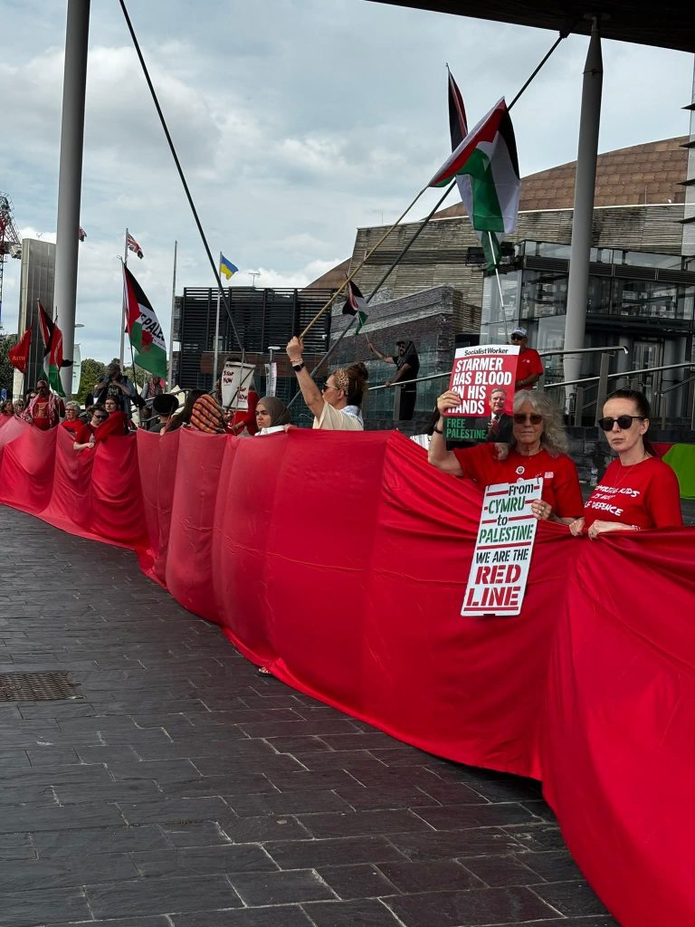 The protest, titled “Red Line for Palestine”, saw participants from across Wales forming a human chain draped in red fabric to symbolise the bloodshed in Gaza. Activists wore red clothing and held placards reading “From Cymru to Palestine – We Are the Red Line” and “Stop Arming Israel”, echoing calls for a ceasefire and an arms embargo.