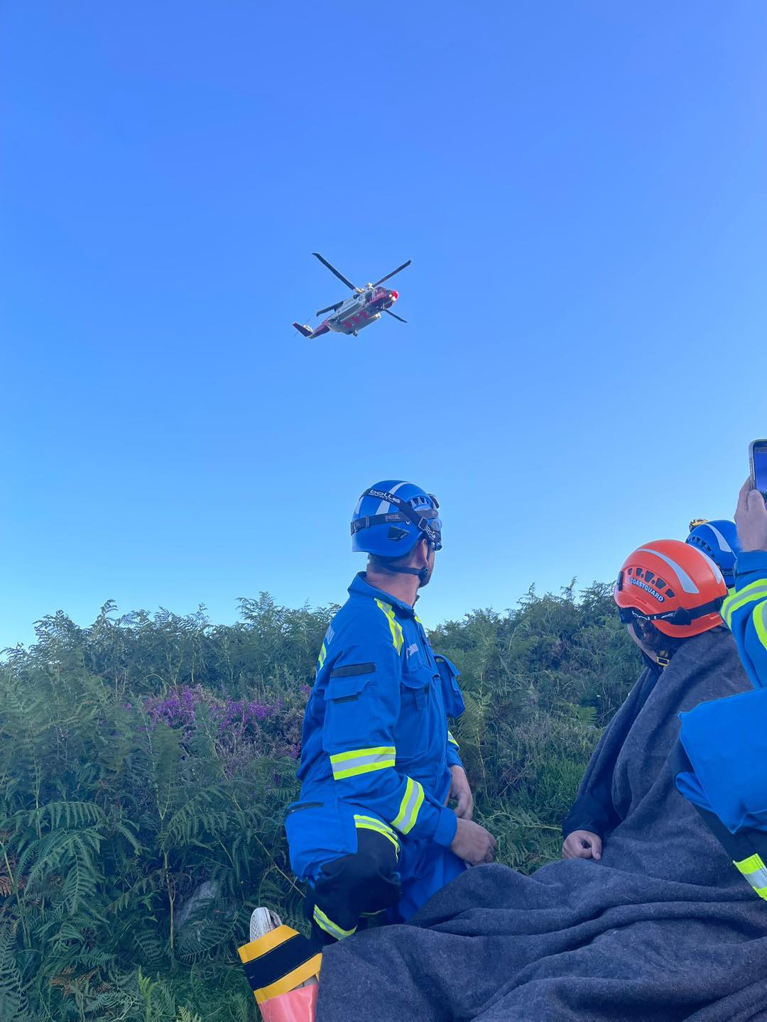 The steep and rocky terrain soon made the evacuation too dangerous for both the casualty and the crew, and a request for helicopter support was made. A rescue helicopter arrived shortly afterwards, winching the man aboard before flying him to hospital for further treatment.
