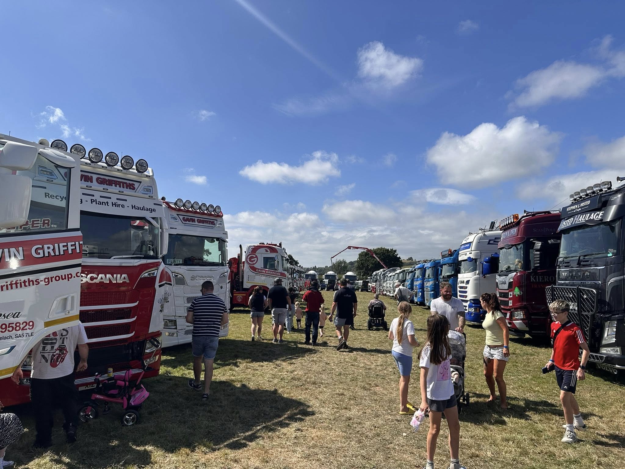 Families and enthusiasts strolled through lines of polished trucks, their paintwork and chrome shining in the summer sun. Local and regional haulage firms were strongly represented, with names like Gavin Griffiths, Kieran’s Haulage, and others proudly displaying their fleets. The atmosphere was friendly and relaxed, with drivers chatting to visitors about their vehicles and the stories behind them.