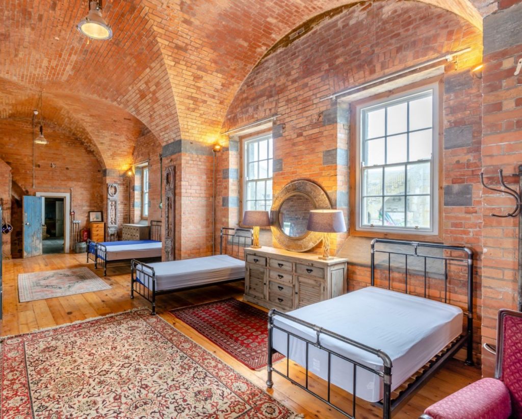 Today, the fortress offers around 8,000 square feet of high-spec living space, blending original stonework and arched windows with modern comforts. It boasts five bedrooms – three with en suites – an open-plan kitchen and snug, and sweeping views from every room.