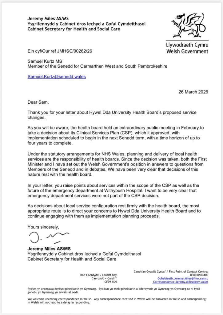 In a letter dated Wednesday (Mar 26), Health Secretary Jeremy Miles told Samuel Kurtz MS that responsibility for the changes lies firmly with Hywel Dda University Health Board — effectively ruling out direct ministerial intervention.