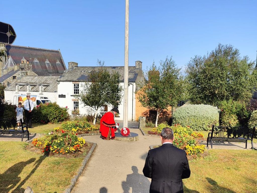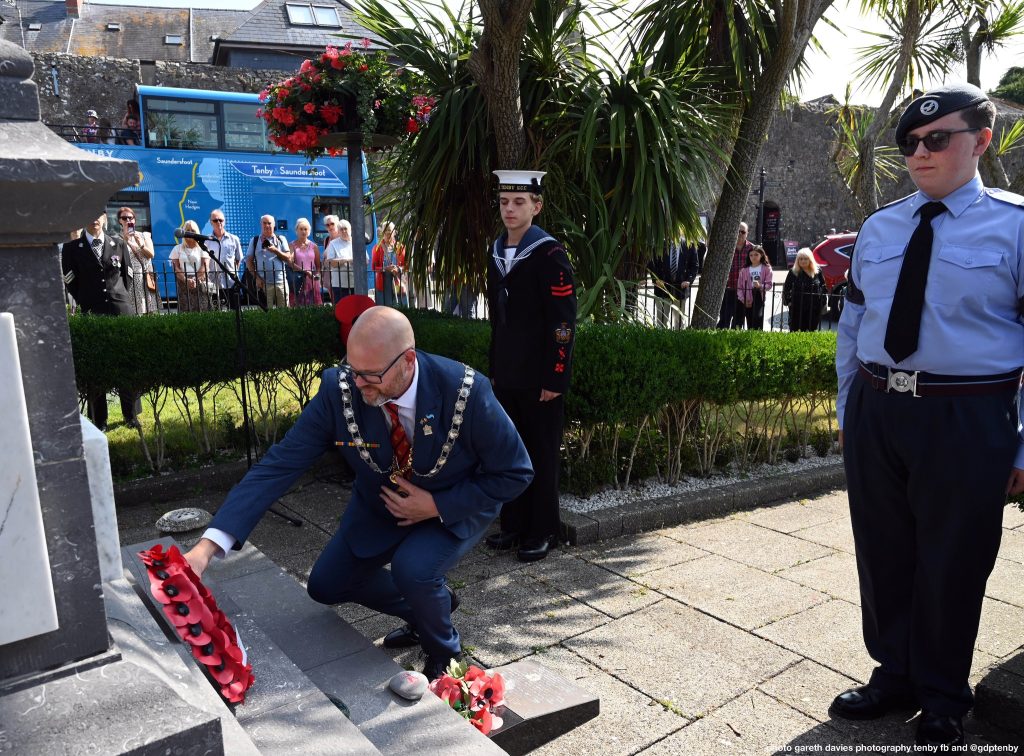 In Tenby, the town’s mayor joined naval and air cadets for a wreath-laying ceremony at the town’s war memorial, where members of the public gathered to witness the tribute.