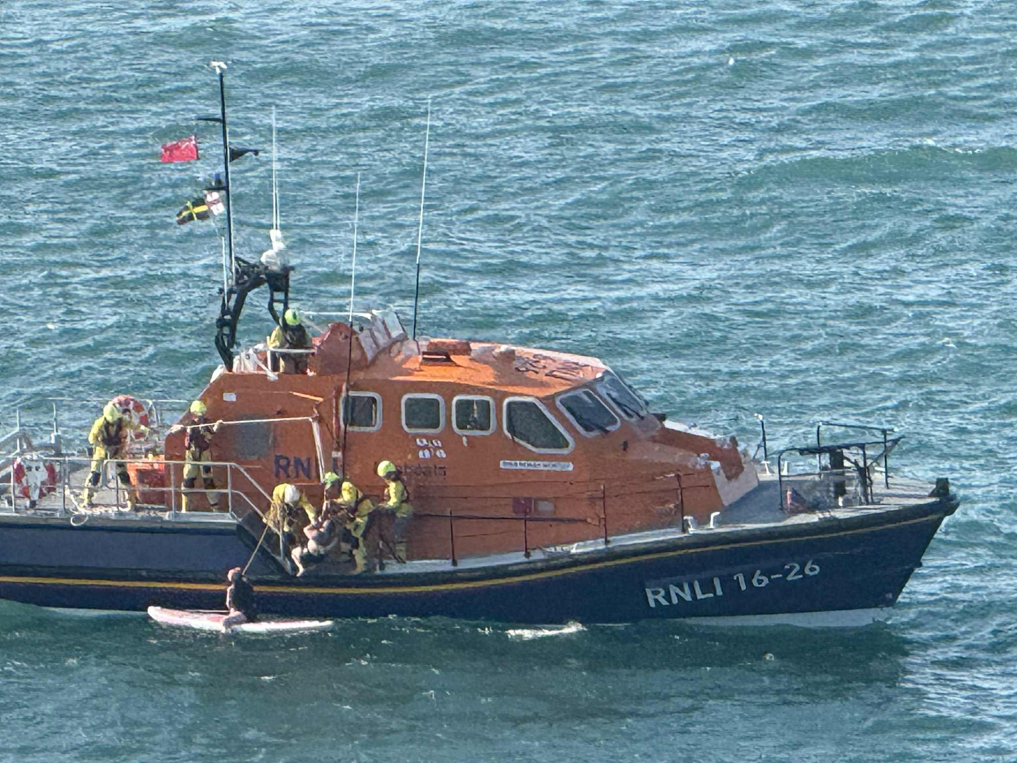 St Davids Coastguard rescue team, who had visual contact from the coast path, directed the lifeboat straight to the casualties. One of the pair was sat on the paddleboard, while the other was in the water clinging to it.