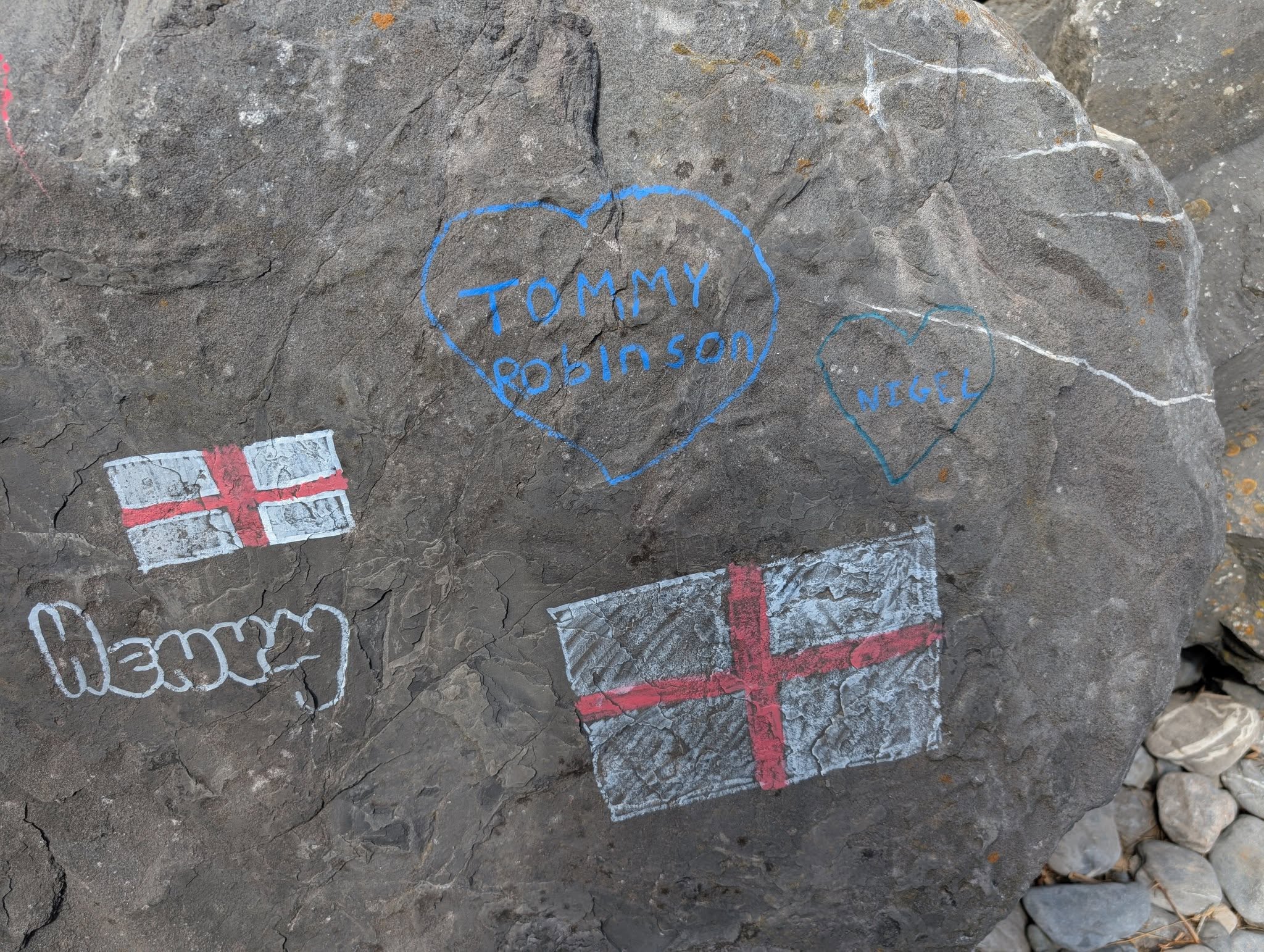 GRAFFITI daubed across rocks at Stackpole Quay has caused anger among locals after slogans referencing Tommy Robinson, Donald Trump, Nigel Farage and farmers were scrawled alongside England flags.