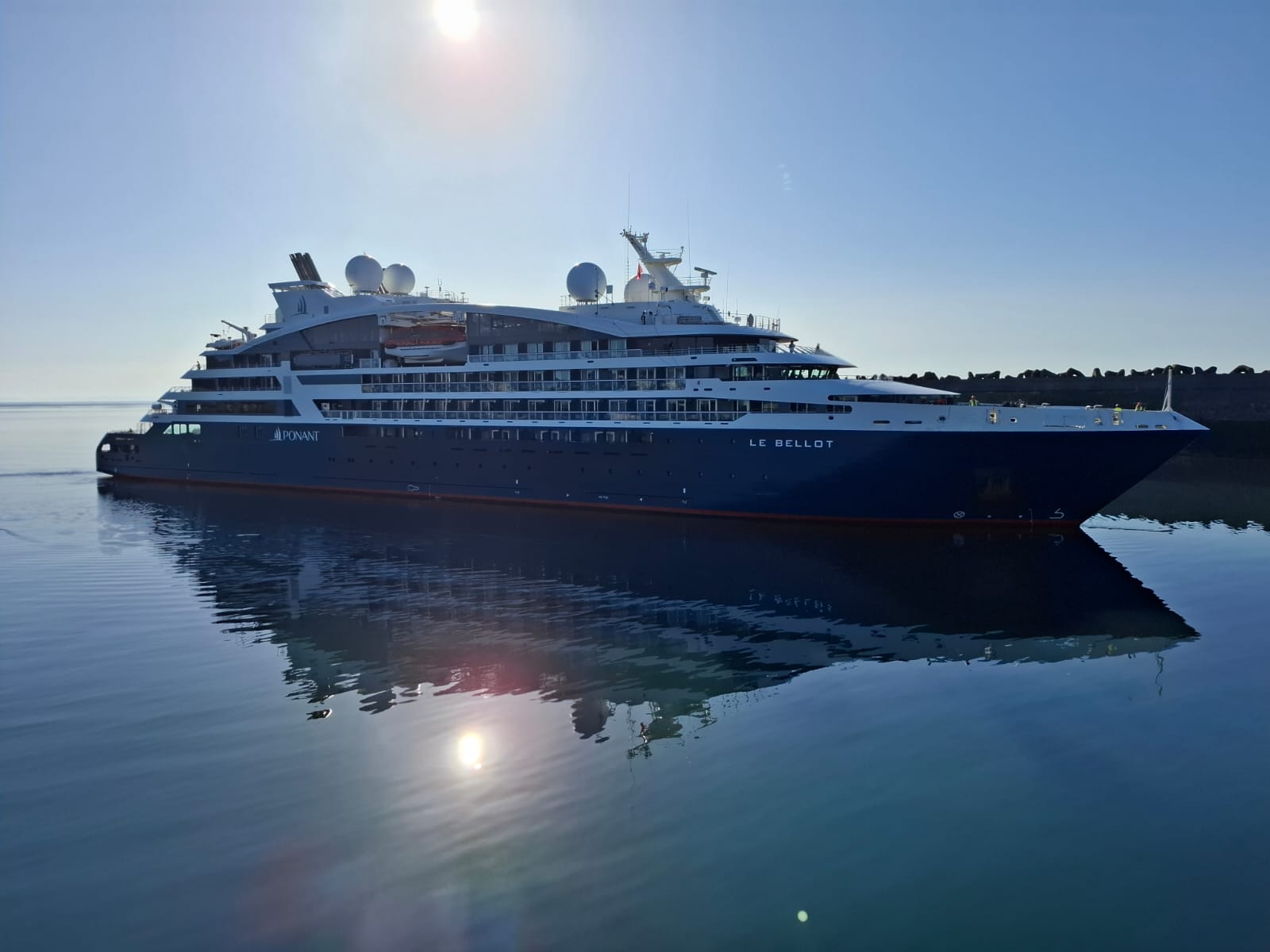 Le Bellot, a luxury vessel built in Norway, carries 184 passengers in 92 staterooms and suites, each with private balconies or terraces. At 430 feet long, the ship has five guest decks and a swimming pool. She will be in Fishguard for a two-day stopover as part of a voyage from Ireland.