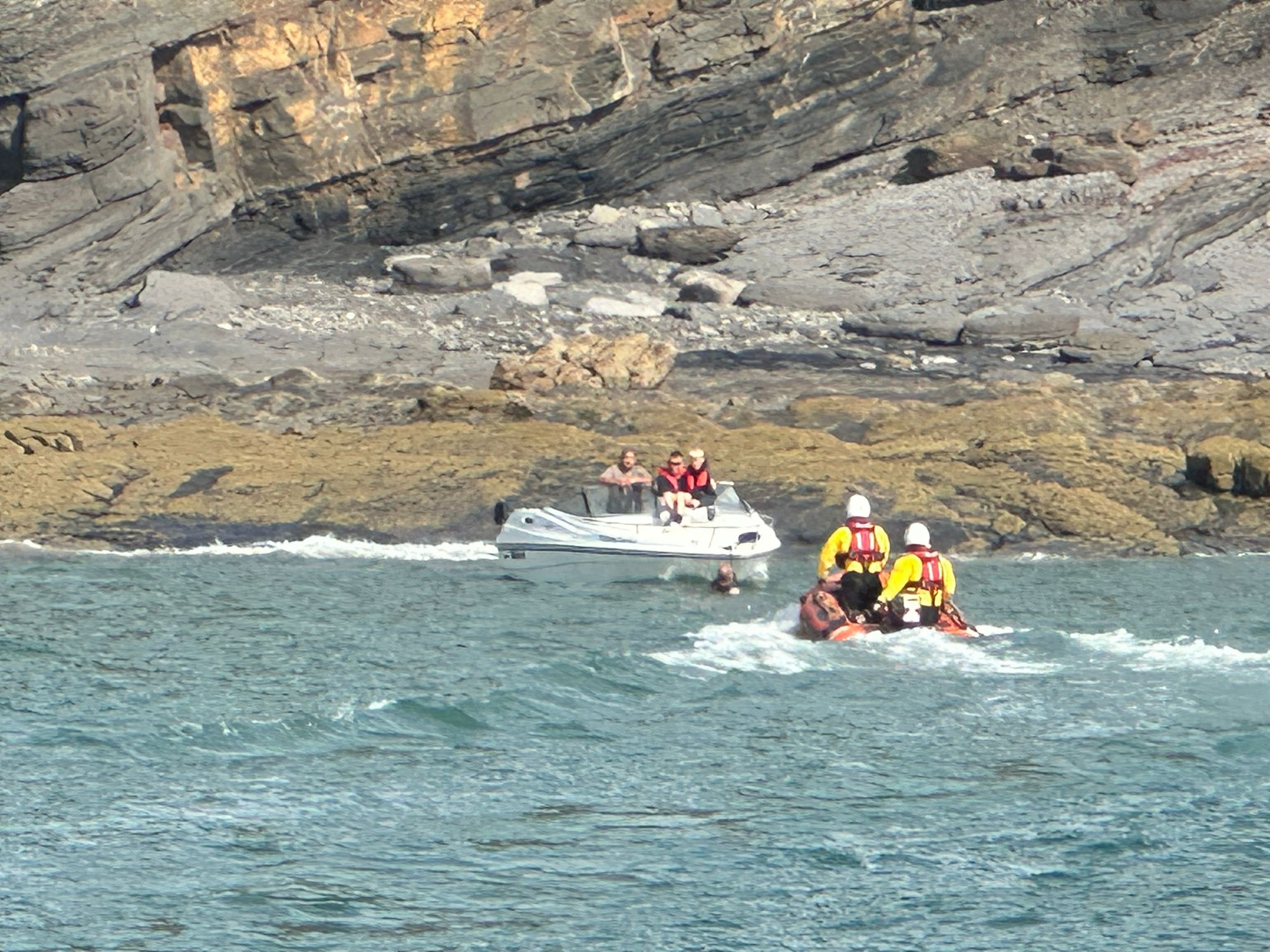 The Y boat was launched and reached the vessel before it struck the rocks. The person in the water was recovered and returned to the casualty vessel, which was then towed clear and passed to the all-weather lifeboat.