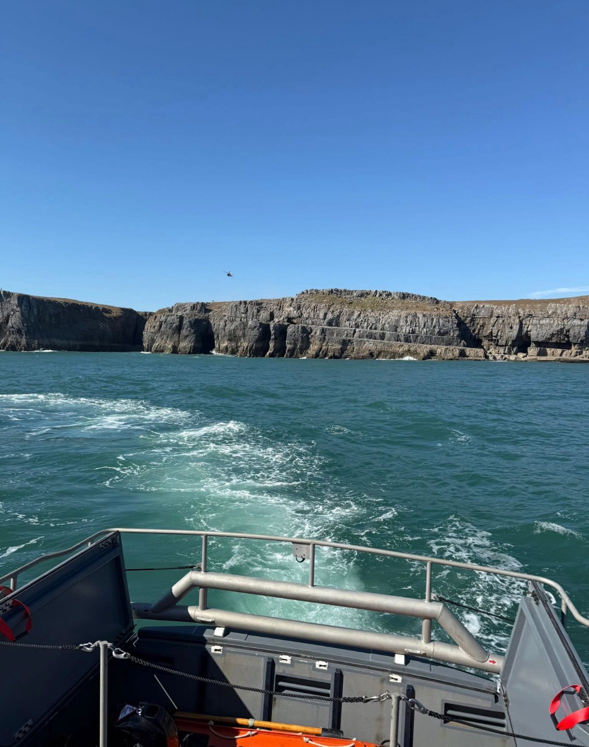 The lifeboat arrived just two minutes behind Coastguard Rescue Helicopter R187 from St Athan, which quickly began assessing the scene. Teams from St Govan’s, Tenby and Dale Coastguard Rescue, along with Welsh Ambulance paramedics, were also on site to support.