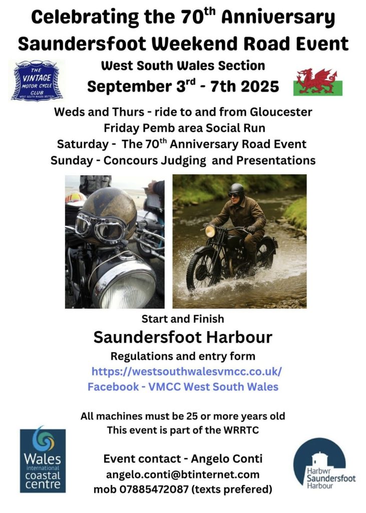 The event begins midweek with rides to and from Gloucester, followed on Friday by a social run around the Pembrokeshire area. The highlight comes on Saturday with the official 70th Anniversary Road Event, starting and finishing at Saundersfoot Harbour. On Sunday, machines will line up for concours judging and the all-important presentations.
