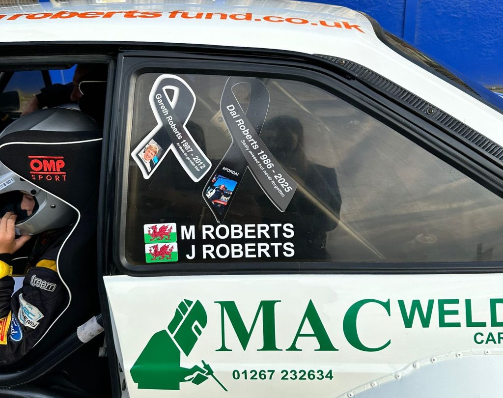 Across the car’s bonnet and windscreen, the logos of the West Wales Rally Spares Jaffa Fund were displayed. The fund was set up to honour the Roberts brothers and continues to help young drivers progress in the sport while also raising awareness of safety in motorsport.