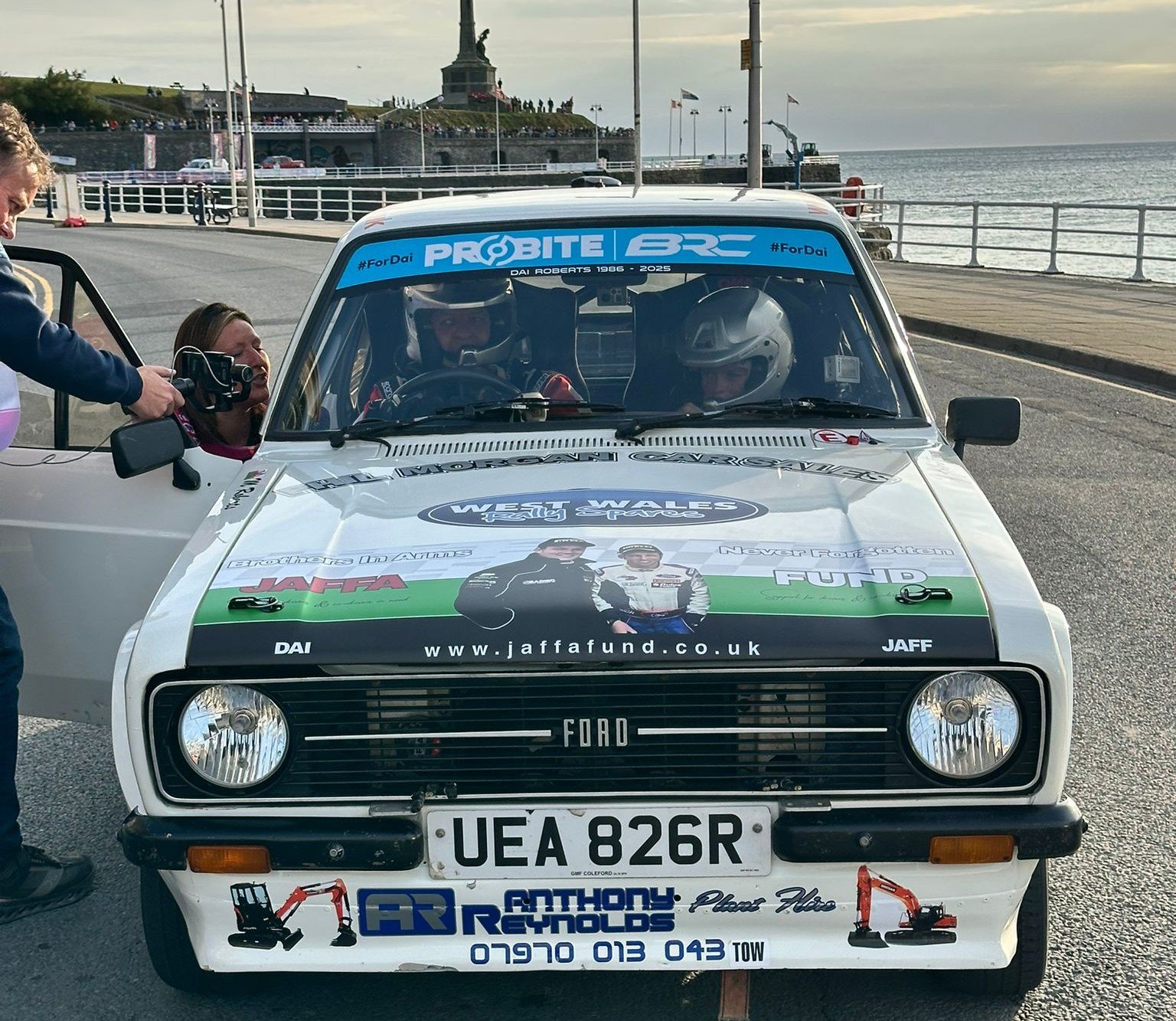 The event attracted strong local interest, with spectators lining the promenade to watch the cars pass against the backdrop of Cardigan Bay. Among the supporters were businesses from across West Wales, including Anthony Reynolds Plant Hire and MAC Welding Carmarthen, whose logos were proudly carried on the Escort.
