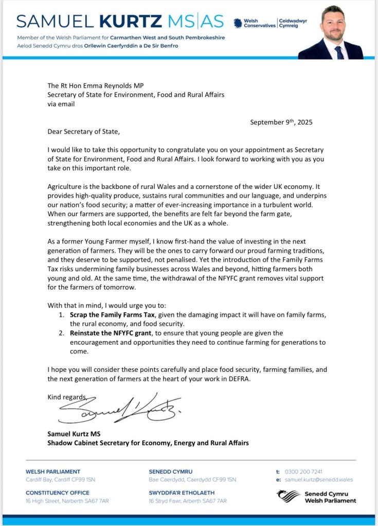 In his letter, the Welsh Conservative MS called for two immediate changes: scrapping the so-called “Family Farms Tax” and reinstating a grant to the National Federation of Young Farmers’ Clubs (NFYFC).