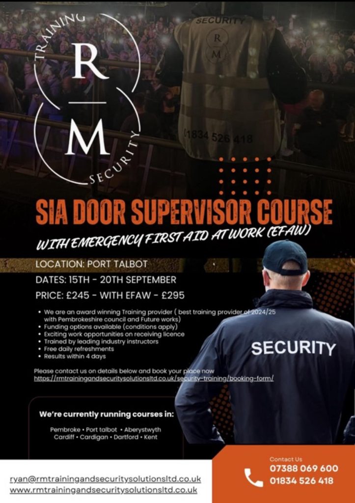 The SIA Door Supervisor Course, which also includes Emergency First Aid at Work (EFAW), runs from September 15 to 20. The programme is being delivered by RM Training and Security Solutions, an award-winning provider recently recognised as the best training provider of 2024/25 by Pembrokeshire County Council and Future Works.