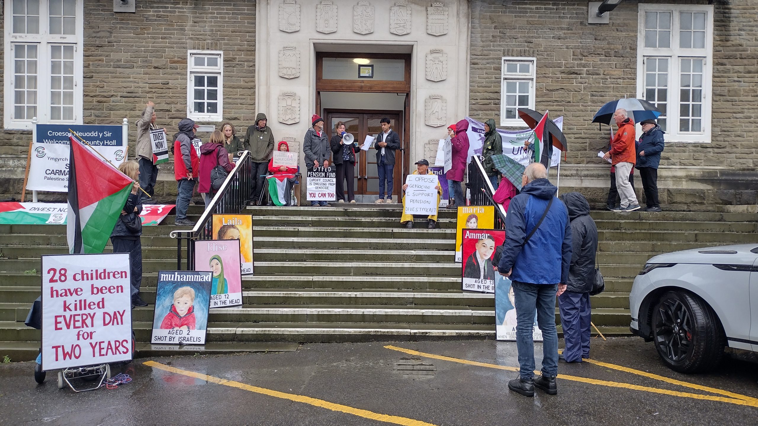 Campaigners from the Palestine Solidarity Campaign (PSC), Cymdeithas y Cymod, and UNISON welcomed the vote, braving heavy rain to greet councillors outside the Carmarthen chamber. UNISON has repeatedly raised objections to the Fund’s links with companies operating in Israel.