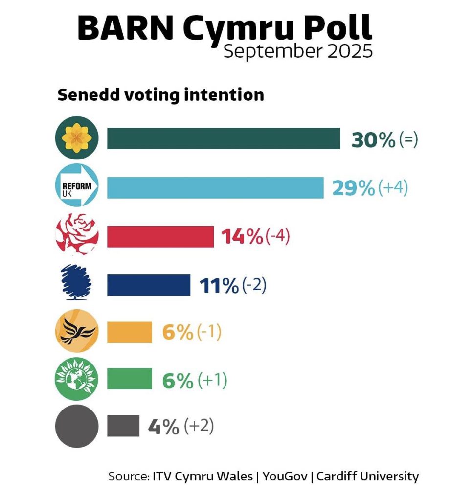 The YouGov poll, carried out for ITV Cymru Wales and Cardiff University, puts Plaid on 30% and Reform UK just behind on 29%. Labour trails far behind on 14%, while the Conservatives are on 11%, the Liberal Democrats on 6%, the Greens on 6% and other parties on 4%.
