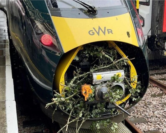 Julia Moffett, a passenger from Pembrokeshire who was on the GWR train involved, described the moment of impact. She said: “It was an awful clatter when we hit the tree. No one was hurt but the poor old train has a compost heap instead of a nose.”