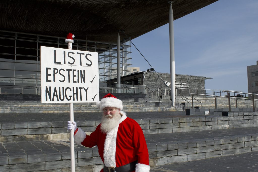 Santa and dinosaur liven up faltering anti-Trump protest at Senedd