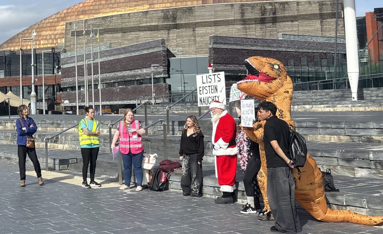 Santa and dinosaur liven up faltering anti-Trump protest at Senedd