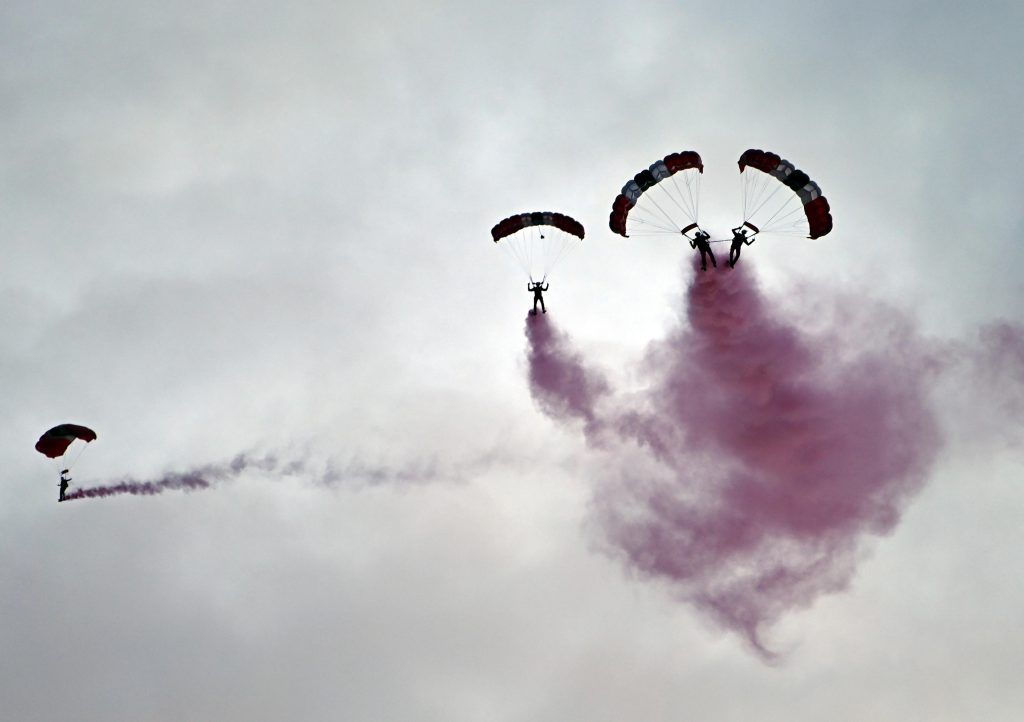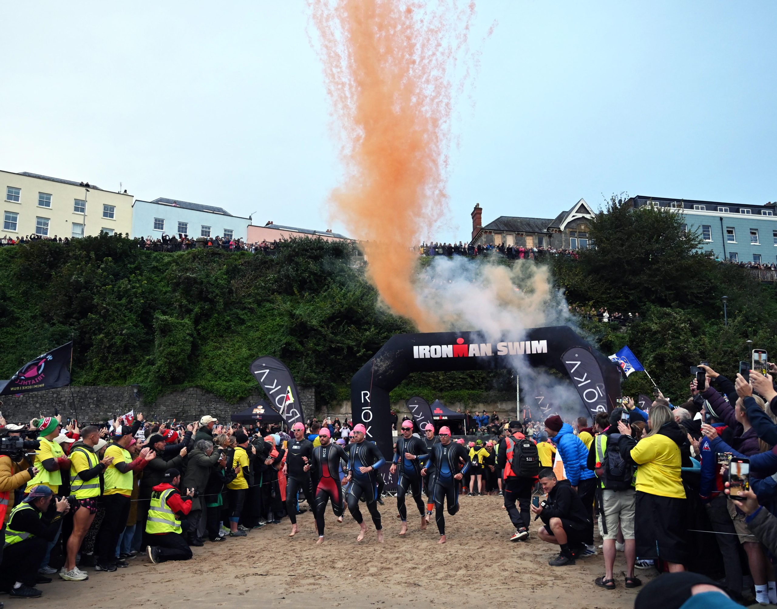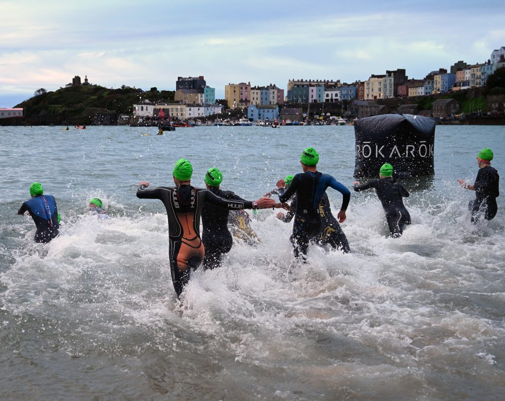 The day began in dramatic fashion with a parachute display over North Beach, filling the skies with coloured smoke as crowds gathered along the seafront. From there, attention turned to the iconic swim start, where more than 2,000 competitors wearing brightly coloured swim caps surged into the waters of Carmarthen Bay.