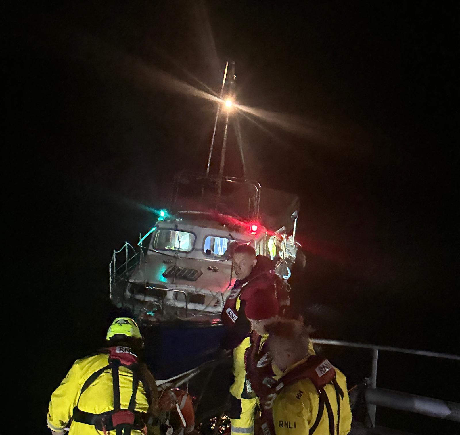 The crew spoke with those onboard, who asked to be escorted back to harbour. A tow was arranged and, after a two-hour operation, the vessel was secured to a mooring in North Bay at 11:15pm. The occupants were transferred to the lifeboat and brought safely ashore.