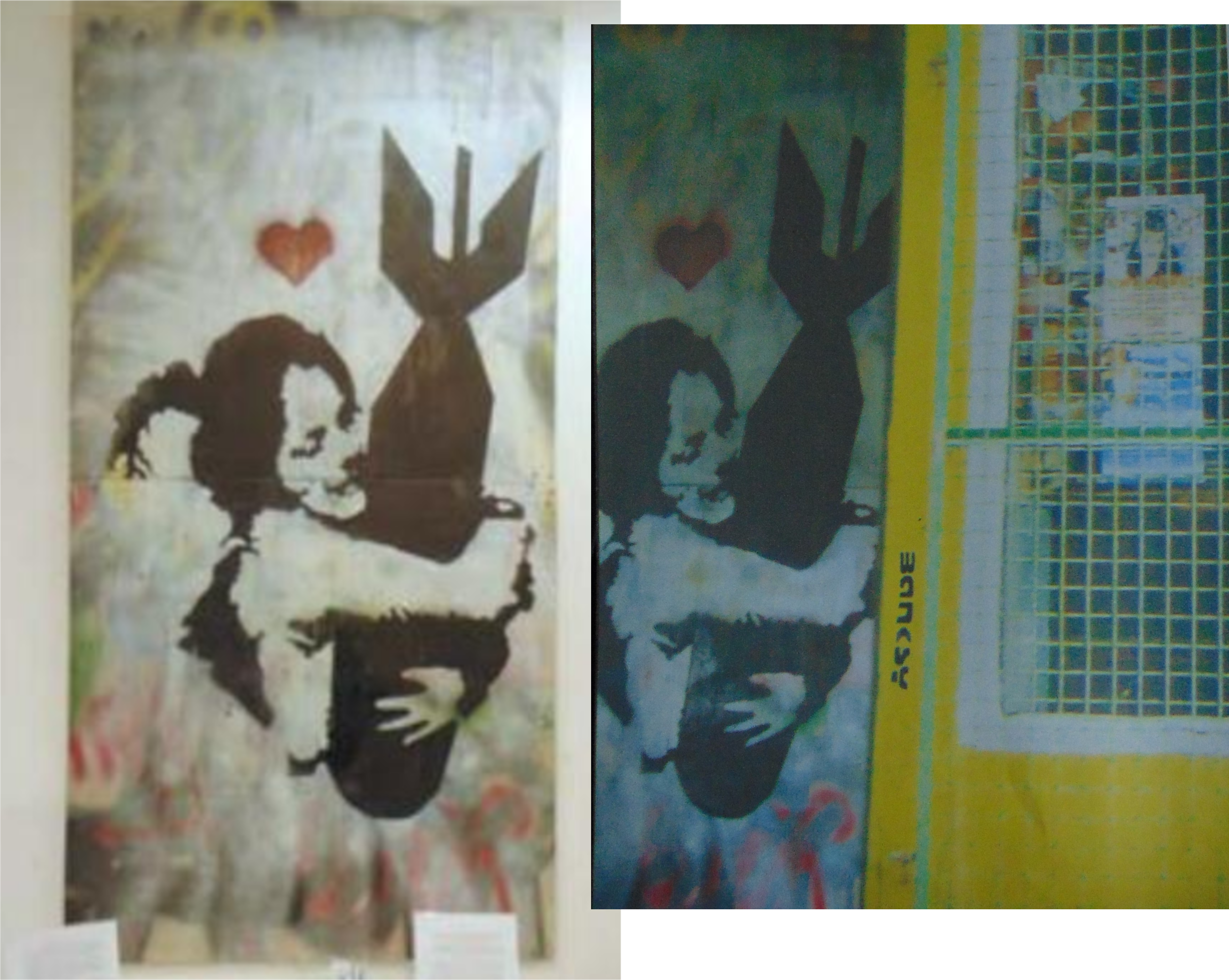 But Hale’s investigation suggests otherwise. He says photographs of the piece taken at the Pembroke Dock exhibition match an image of a painting once seen in a Brick Lane doorway in London, next to a clear Banksy signature.