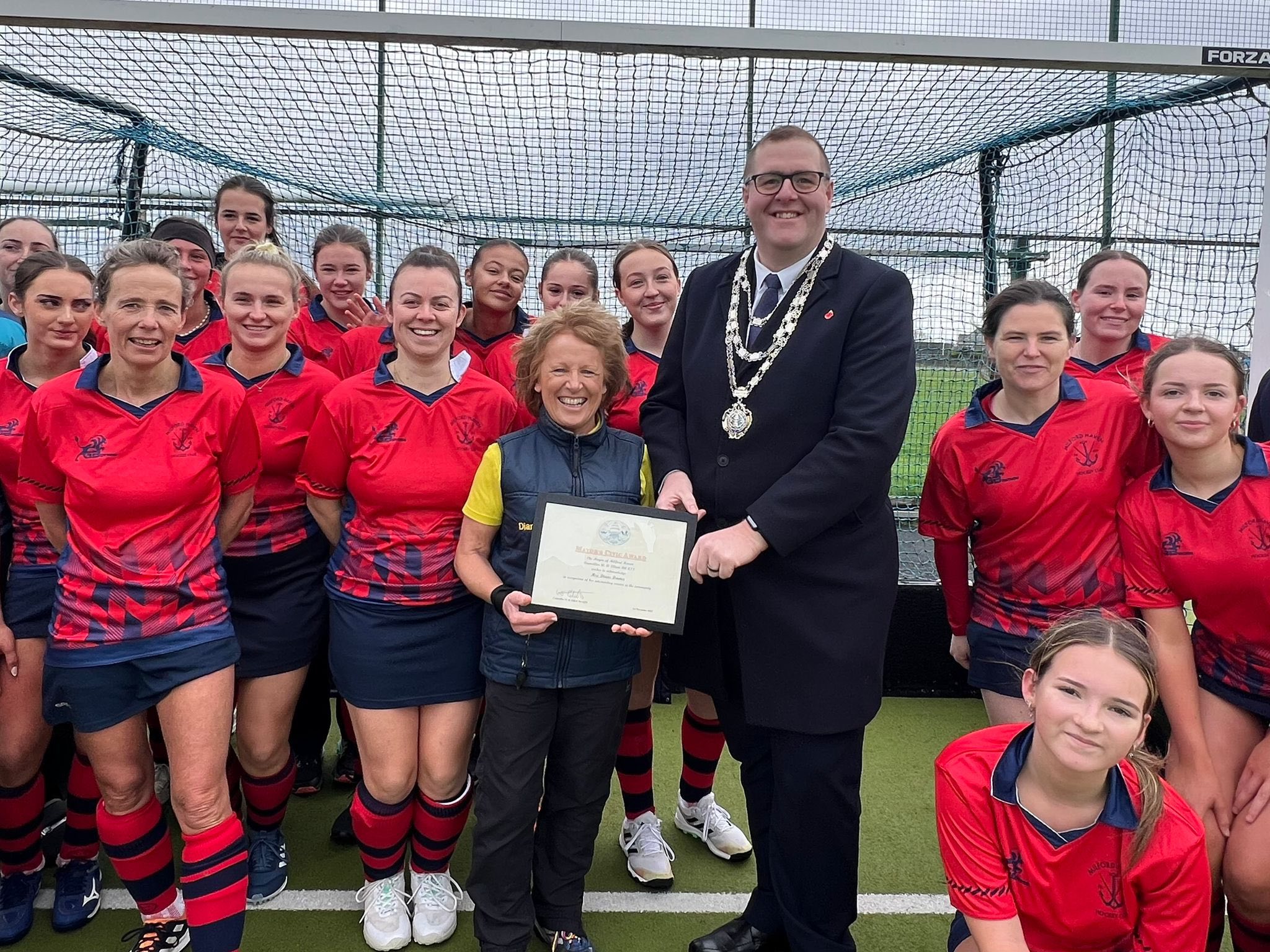 THE MAYOR of Milford Haven, Cllr William Elliott, attended the Milford Haven Hockey Club’s match against Cardiff this afternoon to present a Mayor’s Civic Award to long-serving member Mrs Diane Davies.
