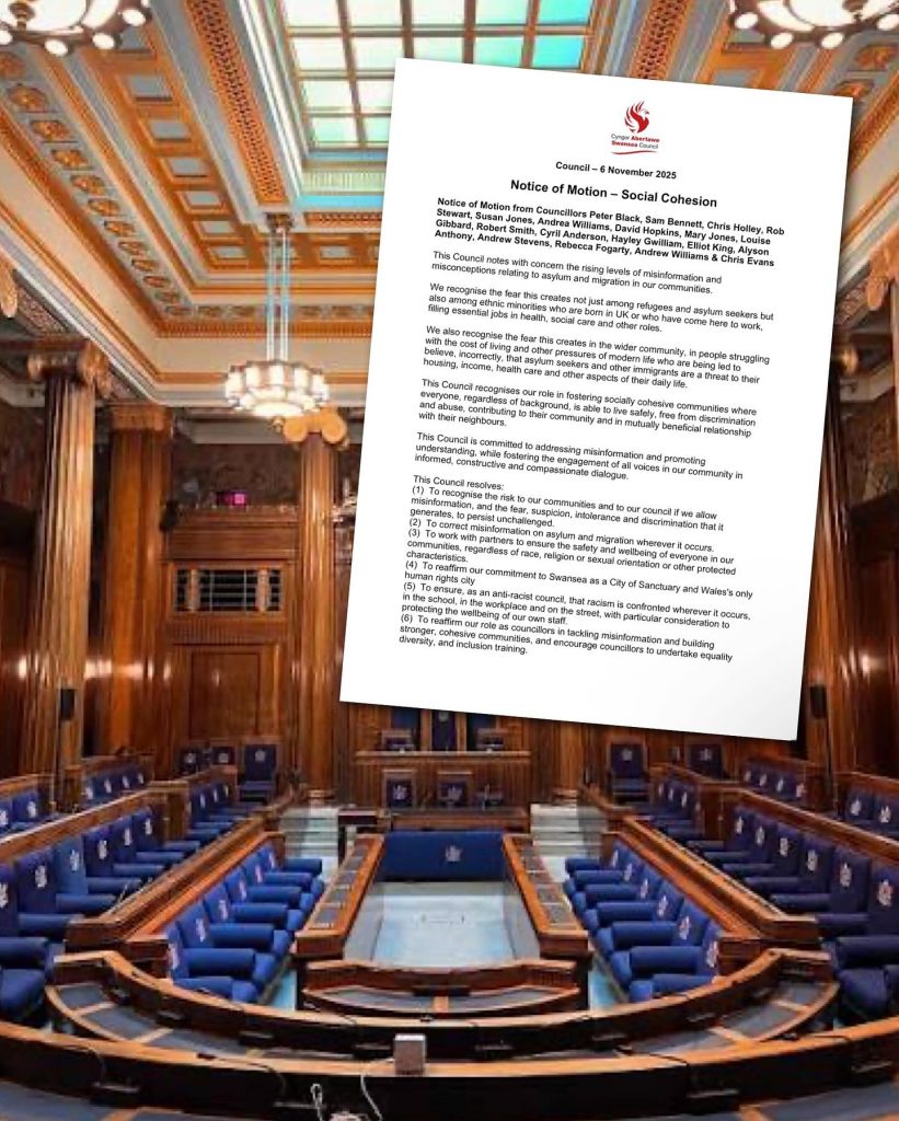 The motion states that the council “notes with concern the rise of misinformation and misconceptions relating to asylum and migration,” and recognises the contribution that refugees and those granted leave to remain make to local services, including health and social care. It also reaffirms Swansea’s identity as a City of Sanctuary and commits councillors to promoting equality, tackling racism, and engaging constructively with local communities.