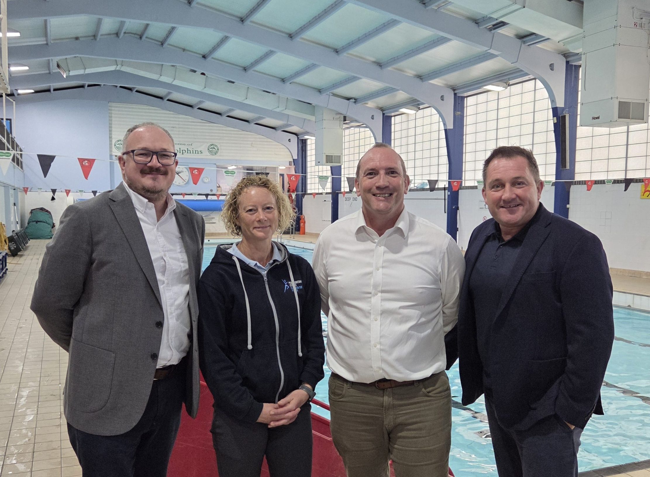 Cllr Marc Tierney (Cabinet Member for Young People, Community, Wellbeing and Future Generations), Mel Morgan (School Swimming Teacher), Gary Nicholas (Leisure Services Manager) and Matthew Evans (CEO of Long Course Weekend).