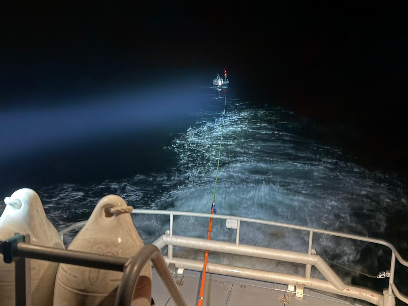 The vessel, with seven crew members aboard, was located just before 11:00pm after the lifeboat made best speed through challenging night-time conditions. Following an assessment by the coxswain, it was decided that, given the vessel’s position, potential hazard to navigation, and the welfare of those on board, the safest option was to take the casualty under tow.