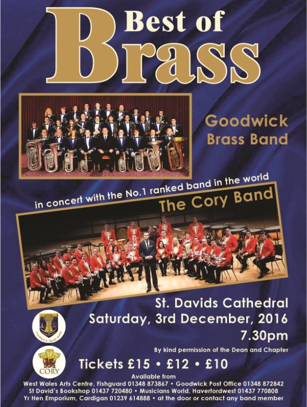 The Goodwick Brass Band will perform in concert with the world-number-one ranked Cory Band at St Davids Cathedral on Saturday, December 3, 2016, at 7:30pm.