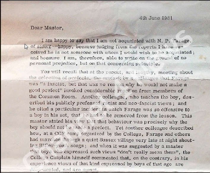 NIGEL FARAGE’S assertion that there is “no contemporaneous record or corroborating evidence” supporting allegations about his school-days conduct has been cast into doubt by the resurfacing of a letter written by a Dulwich College teacher in 1981.