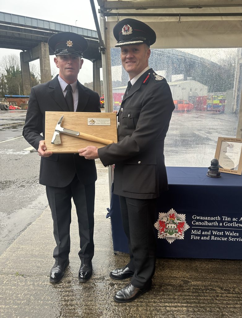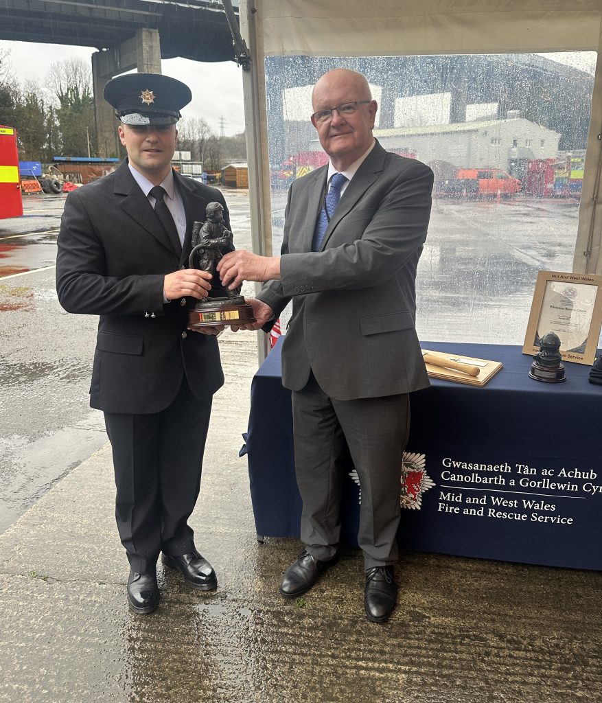 Awarded to the recruit demonstrating the highest overall performance across all aspects of training — including practical skills, written work, examinations, leadership and teamwork — the Silver Axe was presented to Owain Thomas by Chief Fire Officer Craig Flannery.