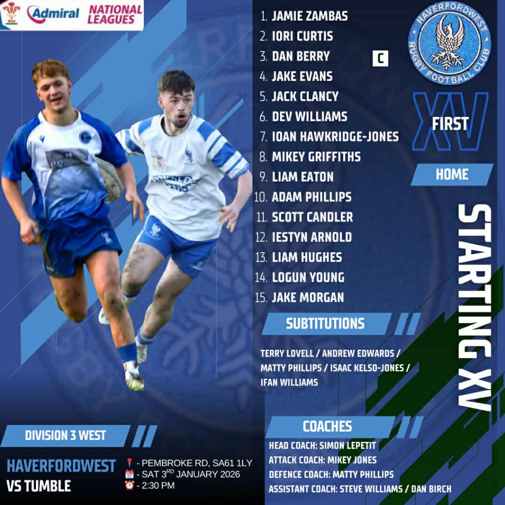 Haverfordwest have named a strong starting XV for the visit of Tumble. Zambo, Young Curtis and captain Dan Berry make up the front row, while Jack Clancy returns to the second row alongside Jake Evs. Dev Williams keeps the number six shirt after a strong Boxing Day performance, with Ioan “The Chop” at seven and Mikey Griff moving to number eight to complete a powerful yet mobile back row.