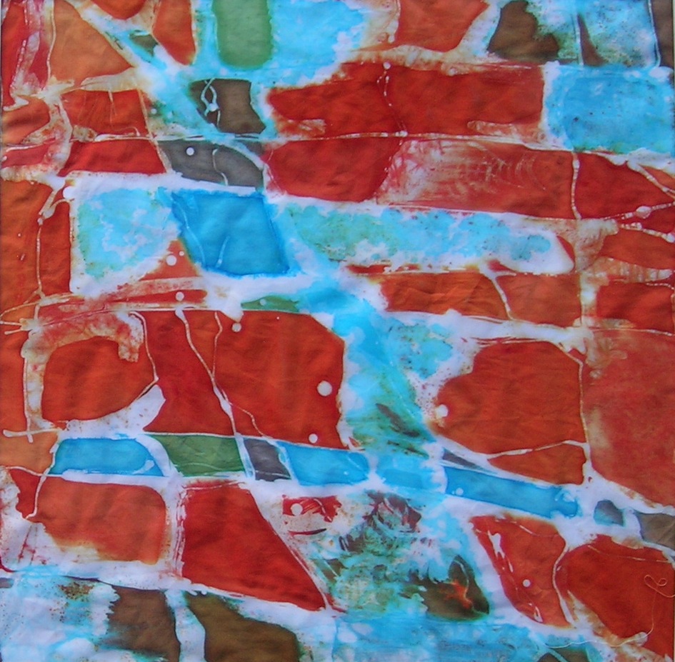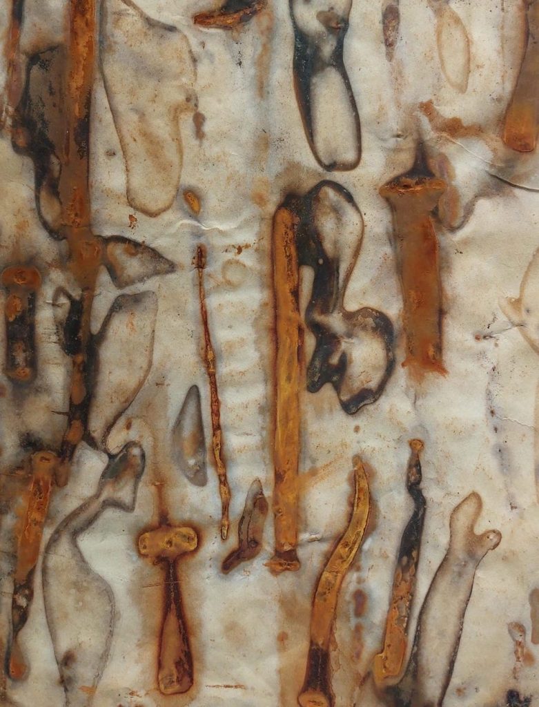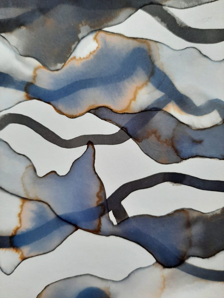 Cassia Gomersall is predominantly a textile-based artist, known for upcycled clothing and artworks created through fabric manipulation, silk-screen printing and natural dyeing. Her practice frequently incorporates recycled, scavenged or foraged materials. Rusted objects found along Pembrokeshire’s coastline are used to produce richly textured, rust-dyed pieces that echo sea spray and saltwater corrosion. Her ink works are largely abstract, capturing moments where sea meets cliff and water meets mountain.