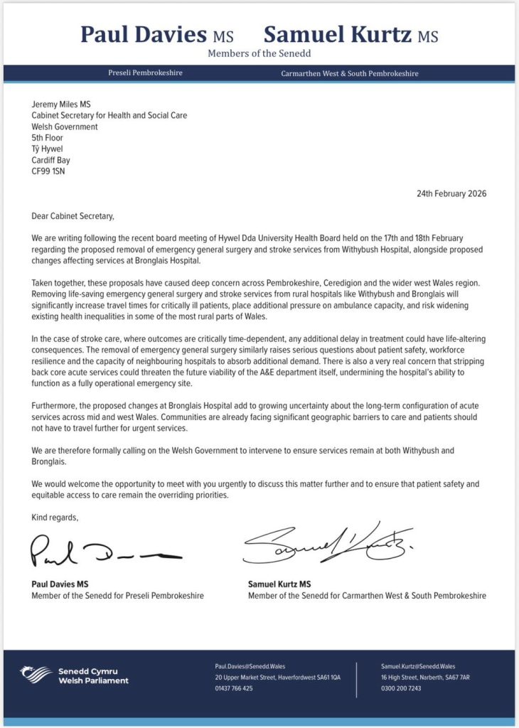Paul Davies MS and Samuel Kurtz MS have written jointly to the Cabinet Secretary for Health and Social Care following last week’s meeting of Hywel Dda University Health Board, where proposals affecting Withybush and Bronglais hospitals were discussed.
