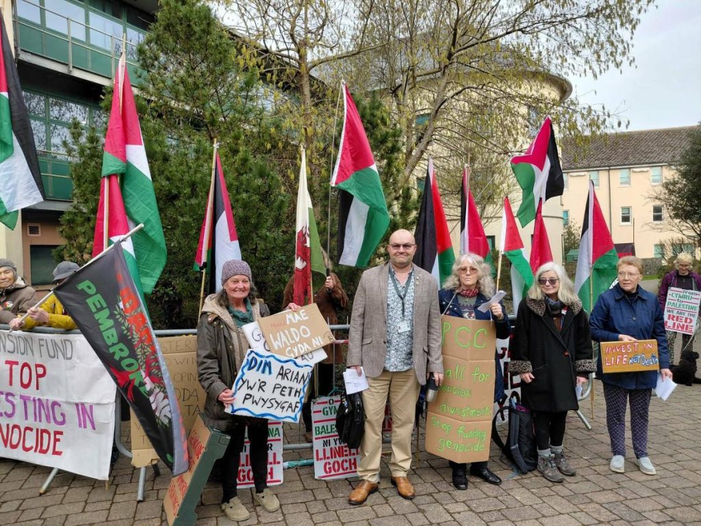 “Outside was a group, Solidarity with Palestine, who had a petition to be heard on Agenda Item No 5, ‘Disinvestment in Companies profiting from Genocide’.